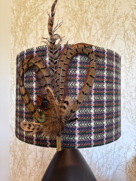 Harris Tweed Lampshades are made in Macleod Harris Tweed,  decorated with Pheasant Feathers, which may differ to the ones in the pictures as nature is unable to make exact replicas.