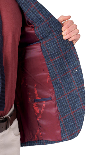 The Perth tailored fit jacket are made from Harris Tweed in a Navy Houndstooth with Wine Overcheck.